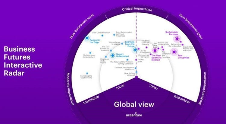 Partiendo de una amplia lista de 400 tendencias, Accenture ha colaborado con asesores externos, académicos e investigadores para reducir la lista a 25 señales de cambio empresarial. Si bien se demostró que las 25 señales madurarían y tendrían un gran impacto en las organizaciones en los próximos tres años. Destacan seis señales como claves en el éxito futuro de las organizaciones:
